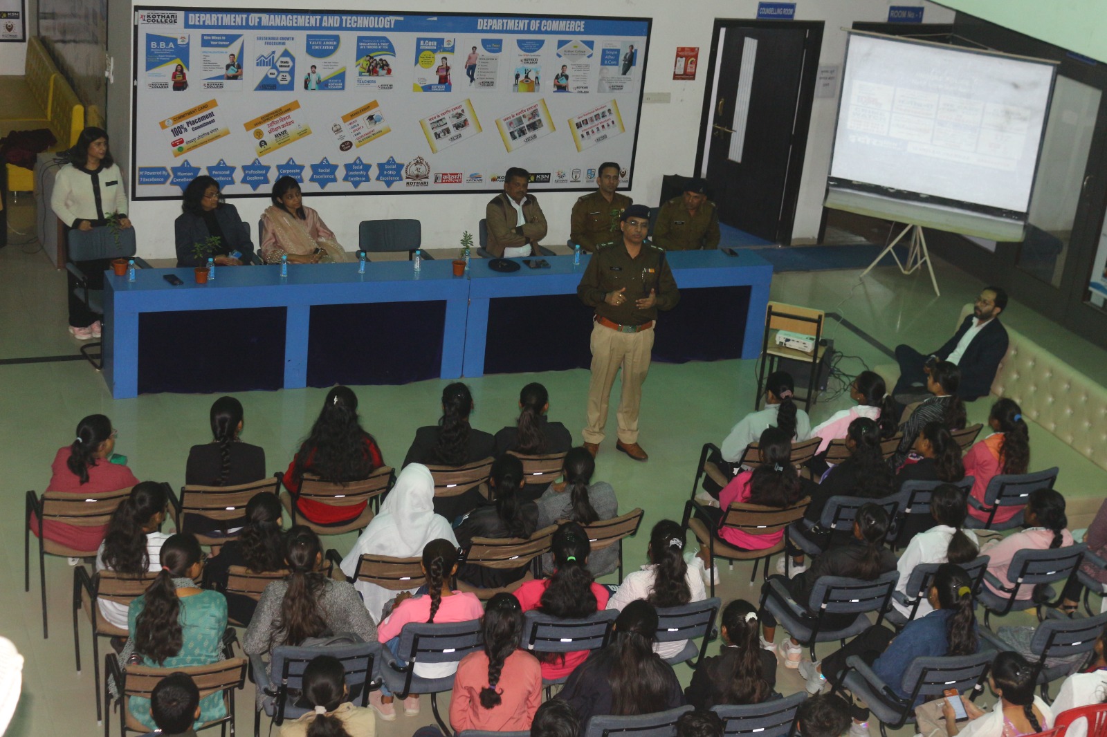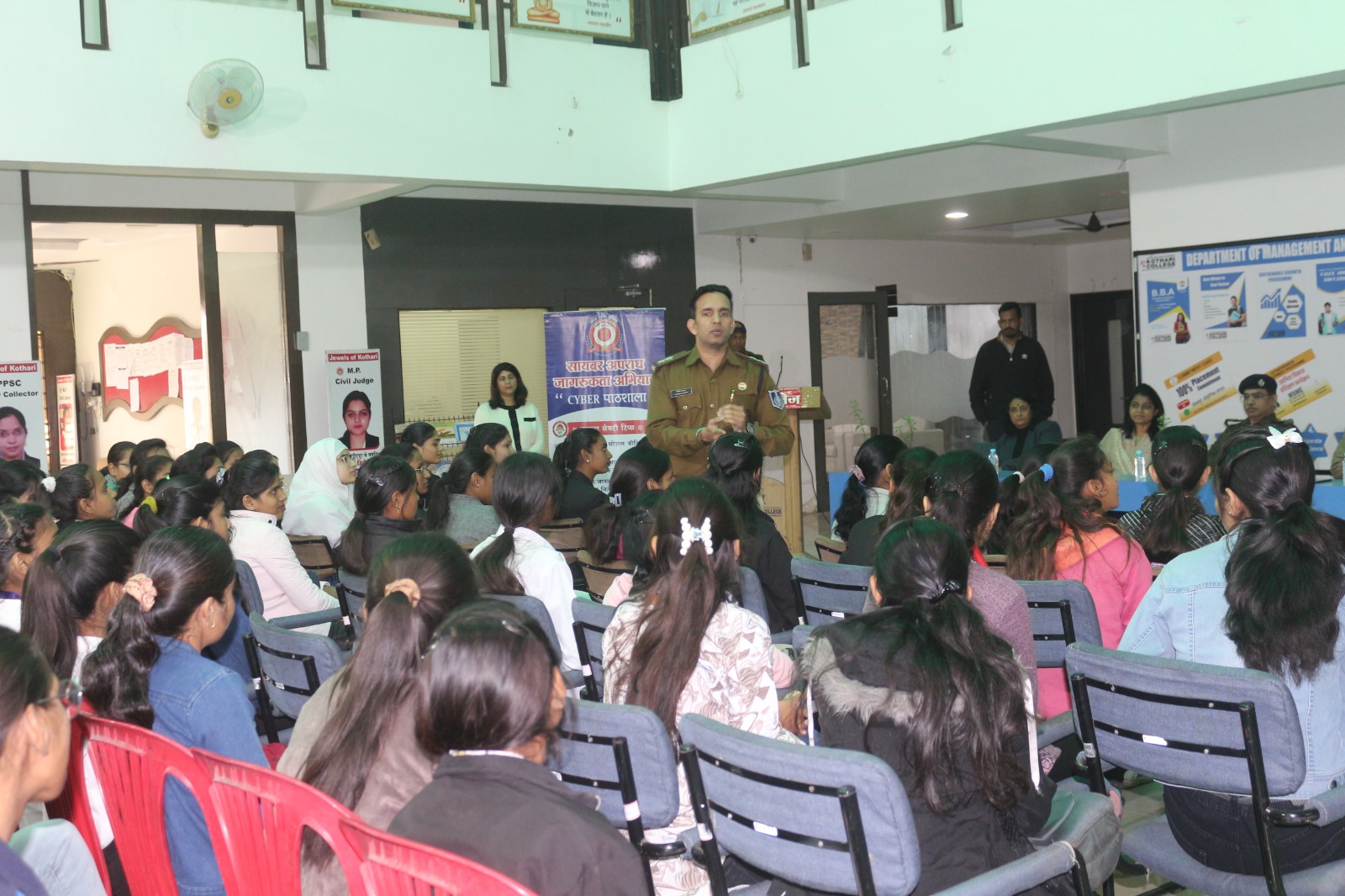 Seminar focusing on crime prevention, cyber security women's safety and drug abuse. DCP Rajesh Tripathi and SI Shivam Thakkar led the sessions, with SI Thakkar discussing the 'Hum Honge Kamyab' campaign. ASI Gajendra Yadav and journalist Sunil Singh Shekhawat also participated. The event concluded with an anti-drug pledge.